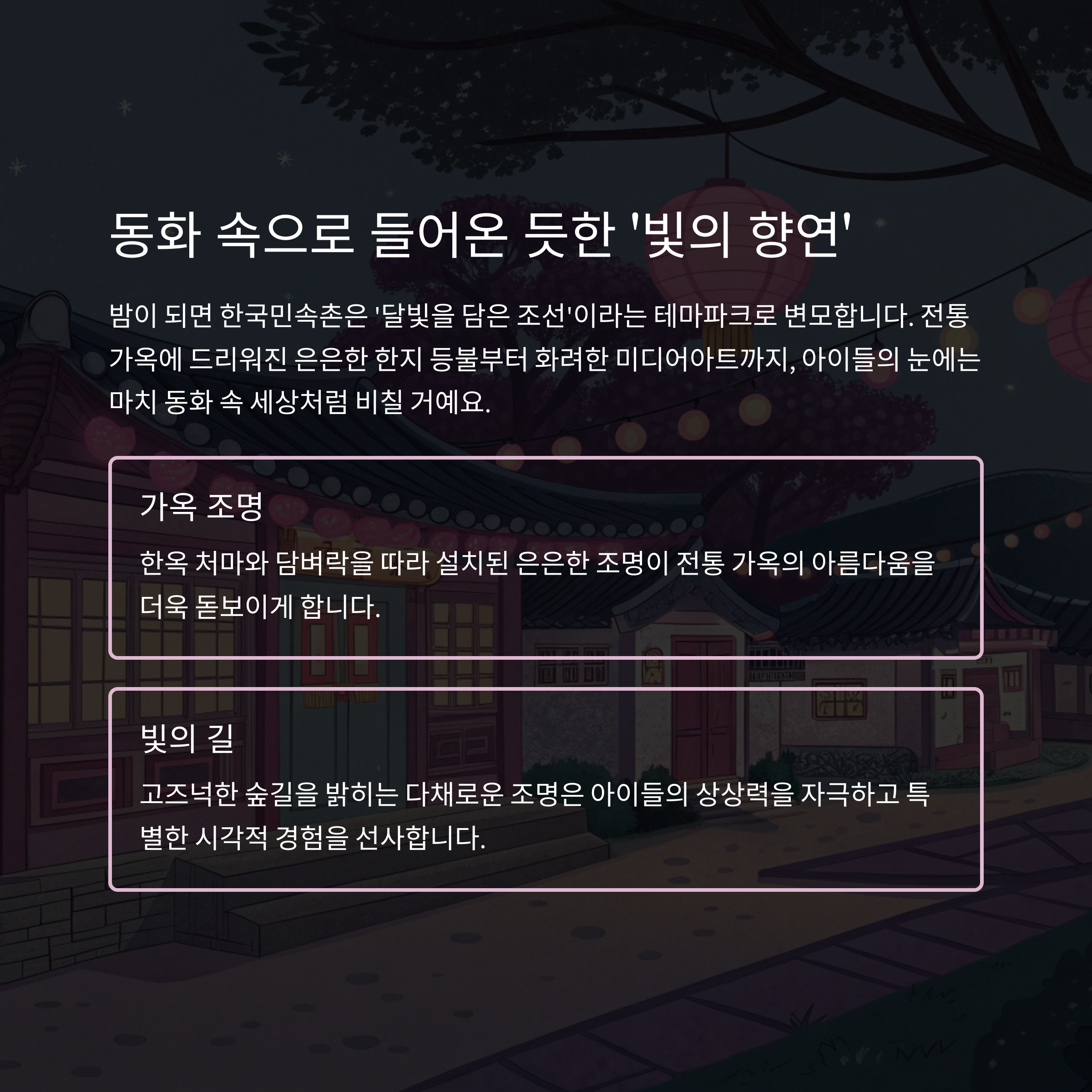 밤이 되면 한국민속촌은 수천 개의 불빛으로 반짝이는 ‘달빛을 담은 조선’이라는 테마파크로 변모합니다. 전통 가옥에 드리워진 은은한 한지 등불부터 화려한 미디어아트, 그리고 고즈넉한 숲길을 밝히는 다채로운 조명까지, 아이들의 눈에는 마치 동화 속 세상처럼 비칠 거예요. 빛으로 재해석된 민속촌의 풍경은 아이들의 상상력을 자극하고, 눈을 뗄 수 없는 아름다움으로 가득합니다. 평소 경험하기 어려운 야간 경관은 아이들에게 특별한 시각적 경험을 선사합니다.