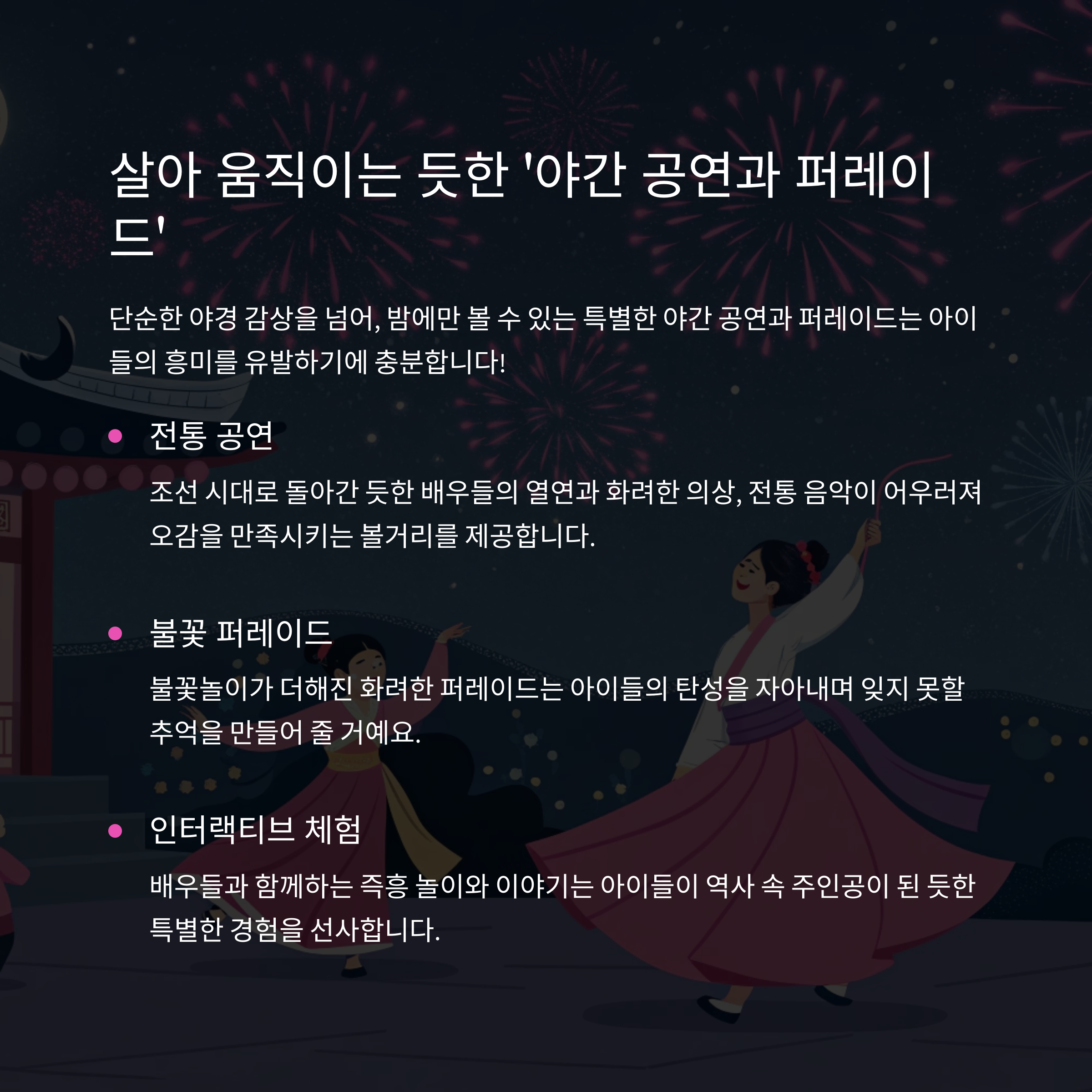 민속촌 야간개장은 단순한 야경 감상을 넘어, 살아있는 역사 교육의 장이 됩니다. 밤에만 볼 수 있는 특별한 야간 공연과 퍼레이드는 아이들의 흥미를 유발하기에 충분합니다. 조선 시대로 돌아간 듯한 배우들의 열연과 화려한 의상, 그리고 전통 음악이 어우러져 오감을 만족시키는 볼거리를 제공하죠. 불꽃놀이가 더해진 공연은 아이들의 탄성을 자아내며 잊지 못할 추억을 만들어 줄 거예요.