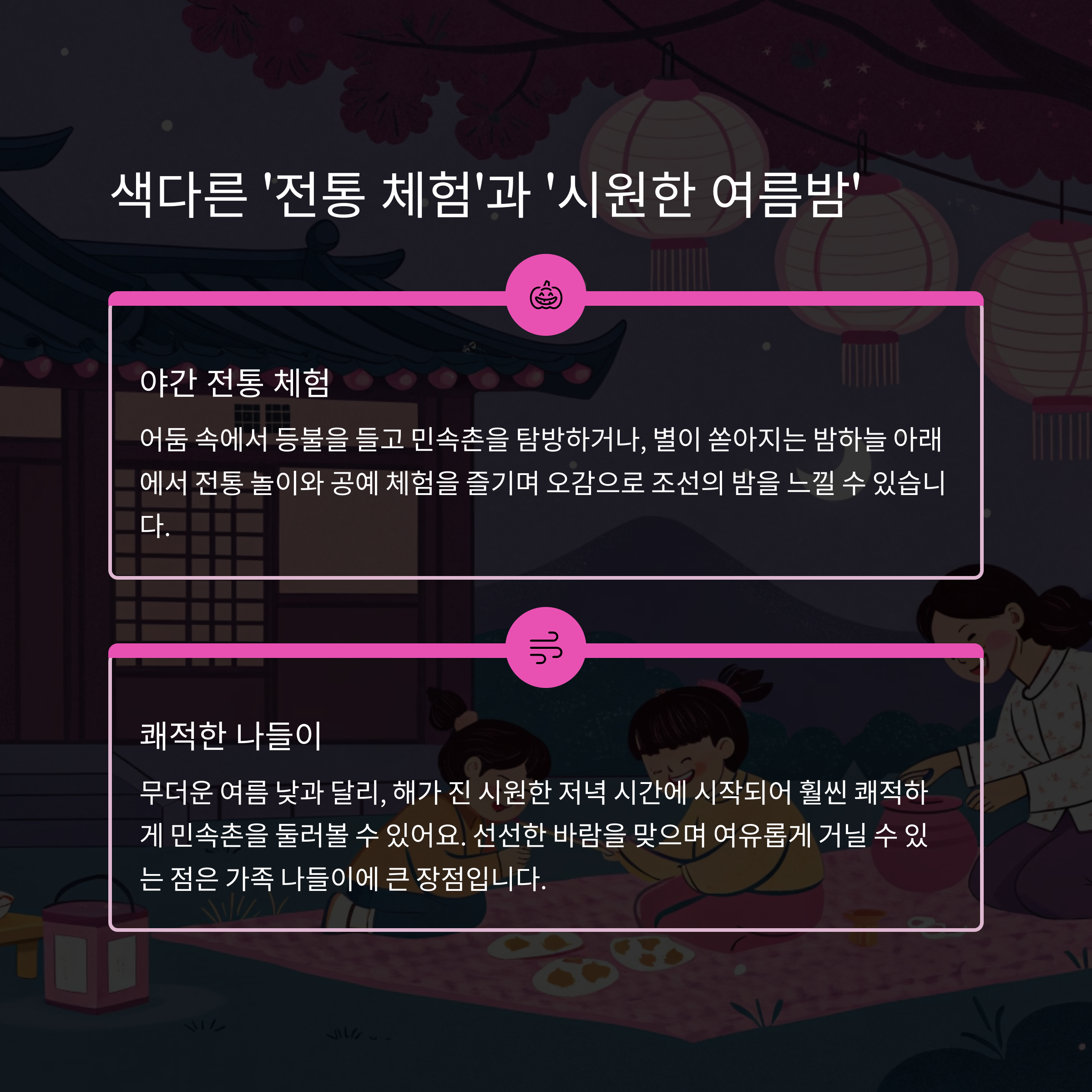 이번 여름밤, 아이와 함께 특별한 시간을 계획하고 계시다면 한국민속촌 야간개장을 적극 추천합니다. 빛과 이야기가 가득한 조선의 밤에서, 아이들의 눈을 반짝이게 할 마법 같은 추억을 만들어 보세요!