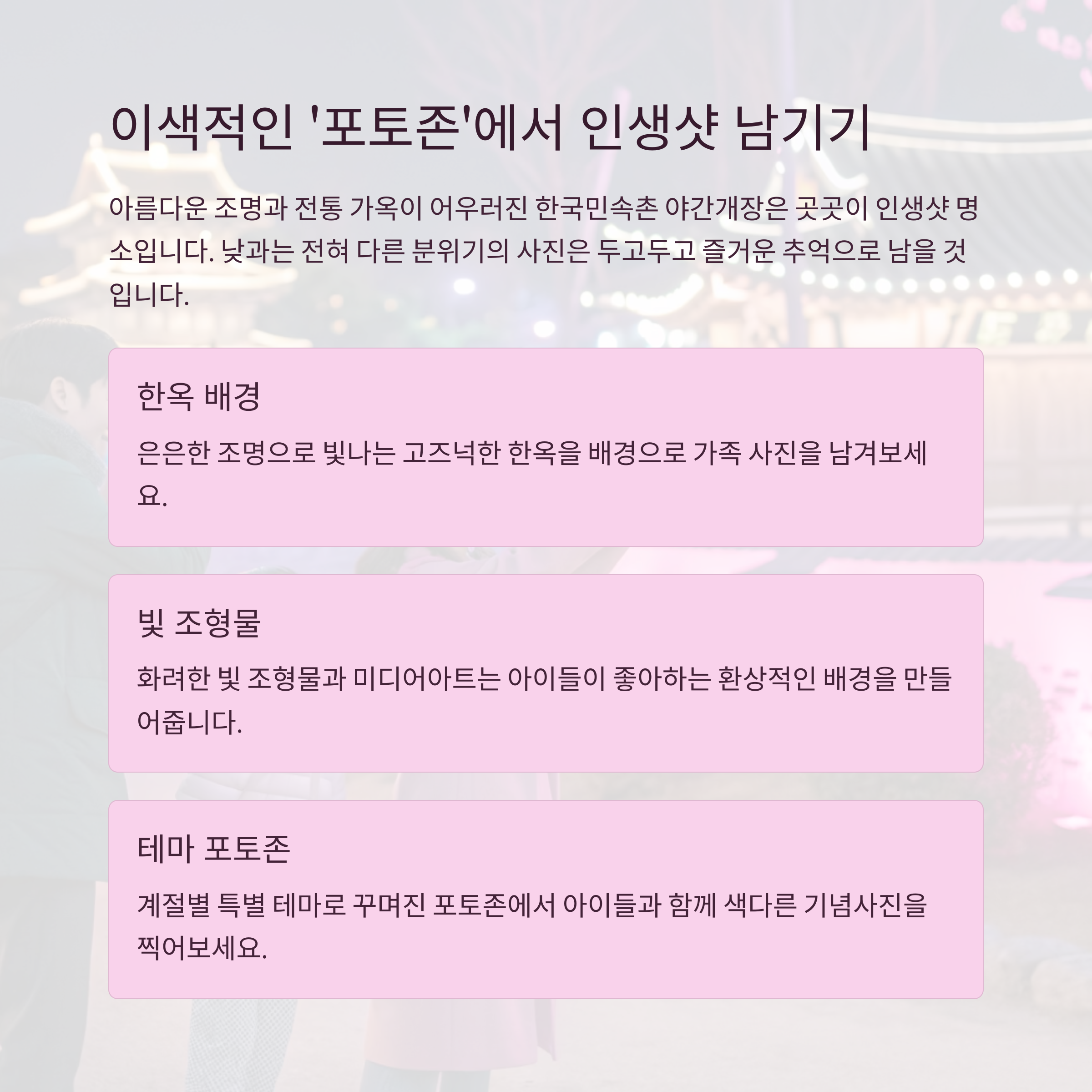 아름다운 조명과 전통 가옥이 어우러진 한국민속촌 야간개장은 곳곳이 인생샷 명소입니다. 고즈넉한 한옥을 배경으로, 혹은 화려한 빛 조형물 앞에서 아이들과 함께 특별한 기념사진을 남겨보세요. 낮과는 전혀 다른 분위기의 사진은 두고두고 즐거운 추억으로 남을 것입니다. 아이들이 좋아하는 캐릭터 복장을 하고 방문한다면 더욱 재미있는 사진을 찍을 수 있을 거예요.