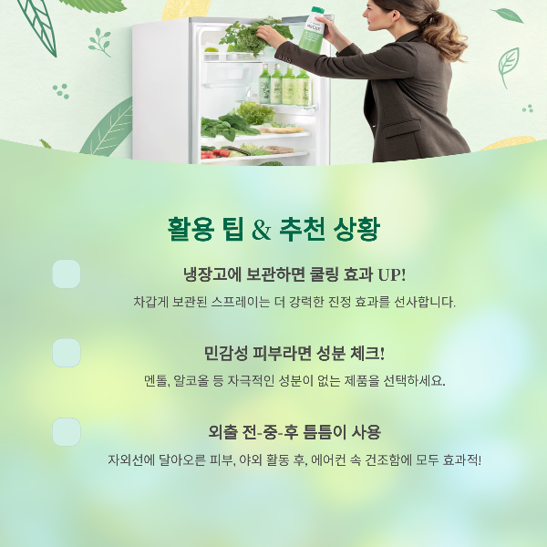 - 민감성 피부라면 멘톨, 알코올 등 자극적인 성분이 없는지 꼭 체크!