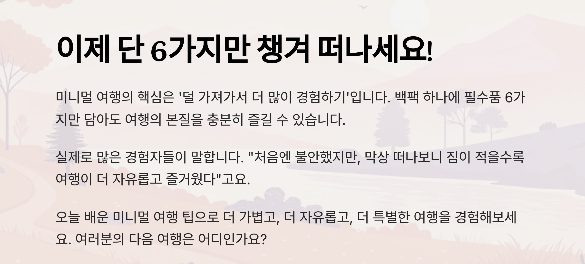 특히 봄·여름·가을·겨울 계절별 필수품, 전자기기 최소 구성, 다목적 아이템 활용법 등을 구체적으로 정리했습니다. 무겁고 복잡한 캐리어나 배낭 대신, 미니멀한 백팩 하나만으로도 충분한 준비를 도와드릴게요.