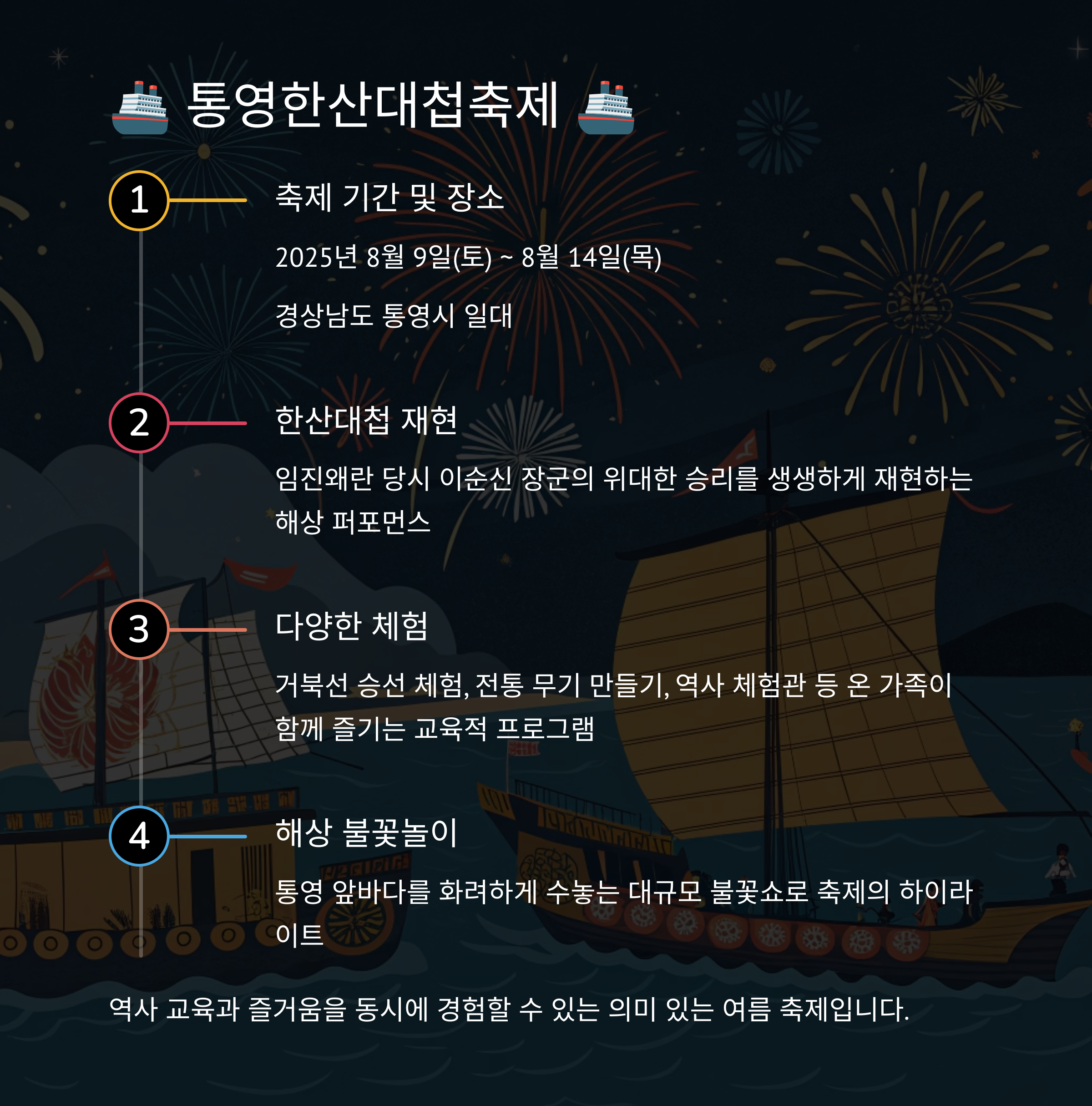 - 특징: 이순신 장군의 한산대첩을 기념하는 역사적인 축제예요. 임진왜란 당시의 해전 상황을 재현한 '한산대첩 재현' 행사는 축제의 하이라이트입니다. 해상 불꽃놀이, 거북선 체험 등 다채로운 볼거리와 체험이 있어 역사 교육과 즐거움을 동시에 잡을 수 있어요.