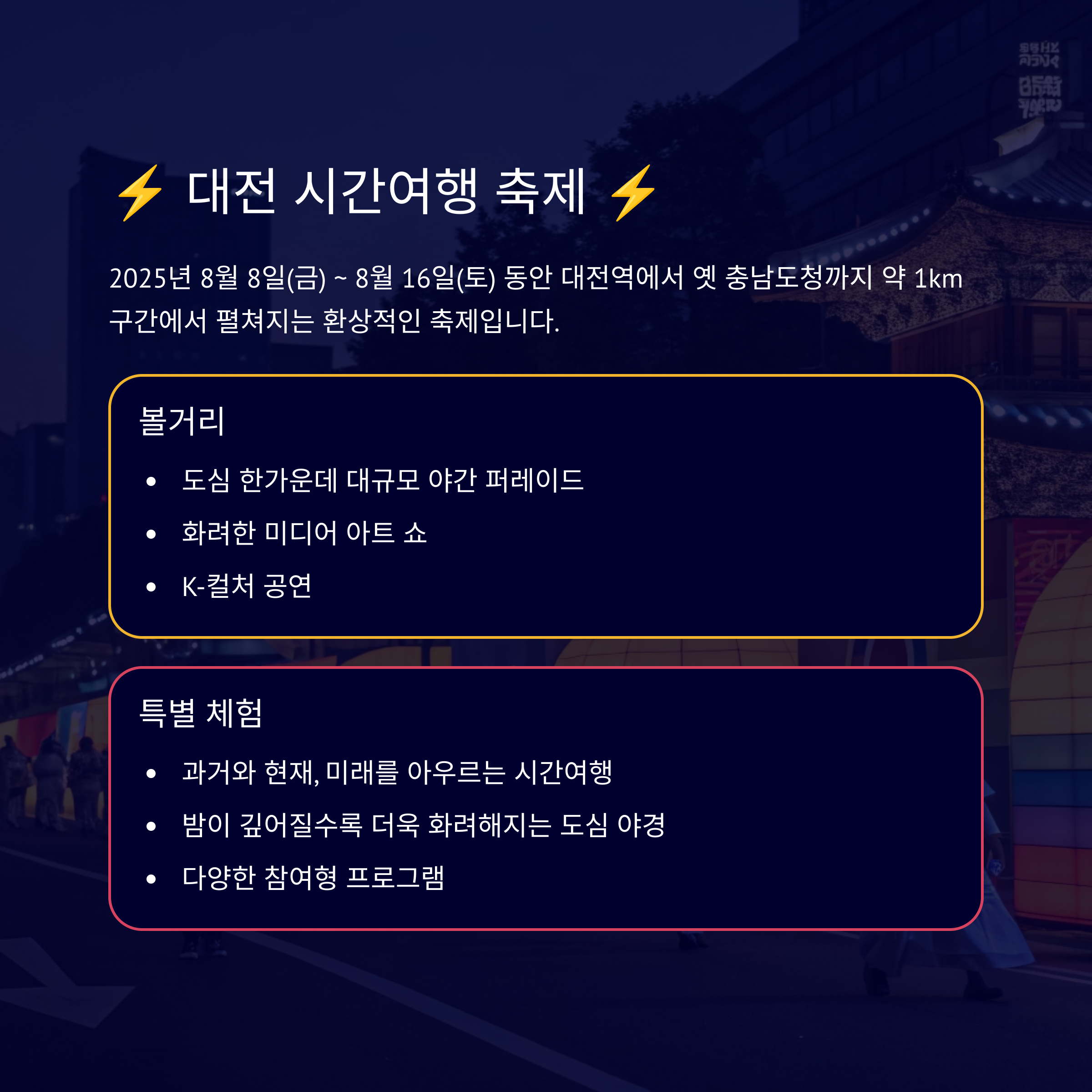 - 특징: 대전의 과거와 현재, 미래를 아우르는 시간 여행형 축제예요. 도심 한가운데에서 펼쳐지는 대규모 야간 퍼레이드, K-컬처 공연, 미디어 아트 등 다채로운 볼거리와 체험 프로그램이 가득합니다. 밤이 깊어질수록 더욱 화려해지는 도심 야경 속에서 특별한 경험을 할 수 있어요.