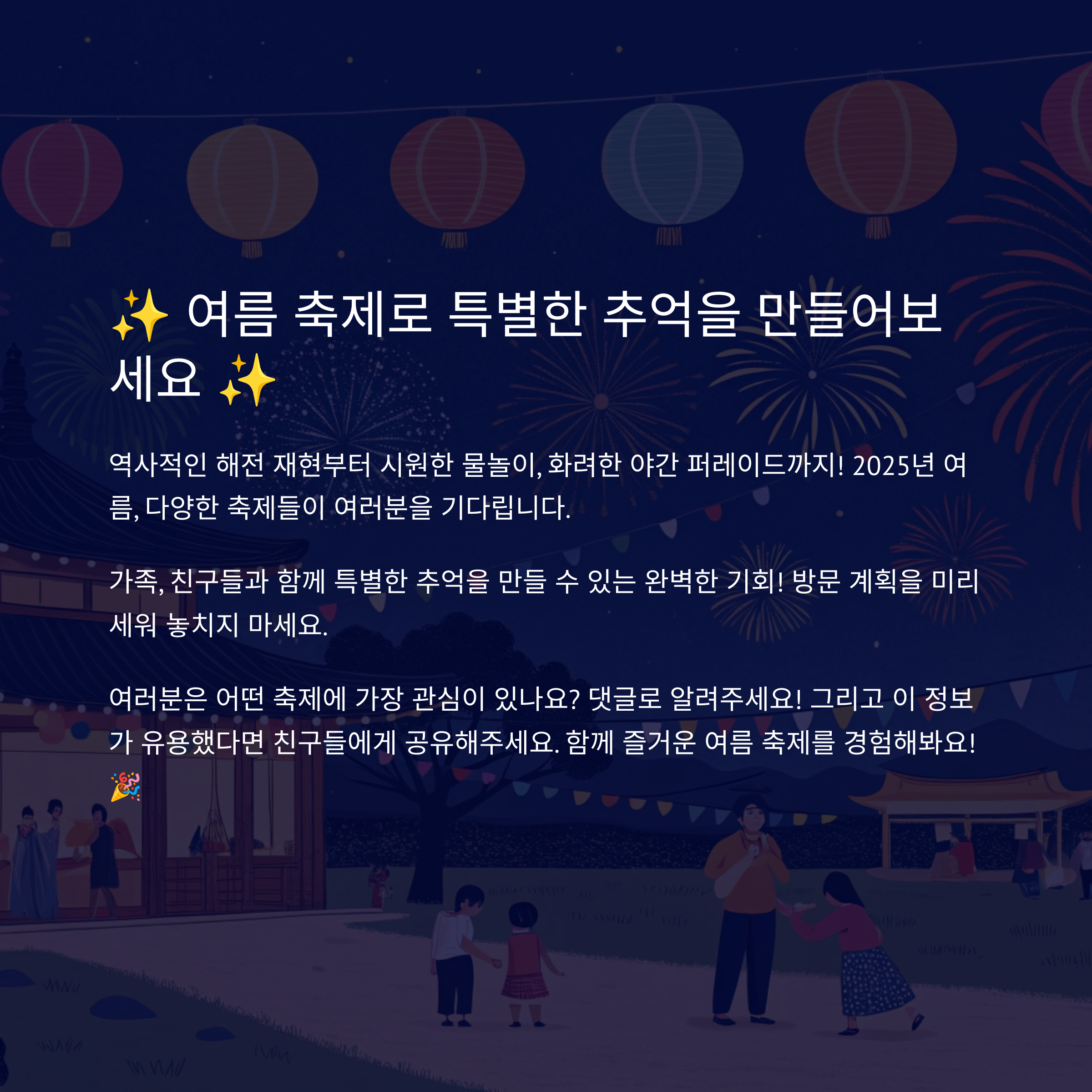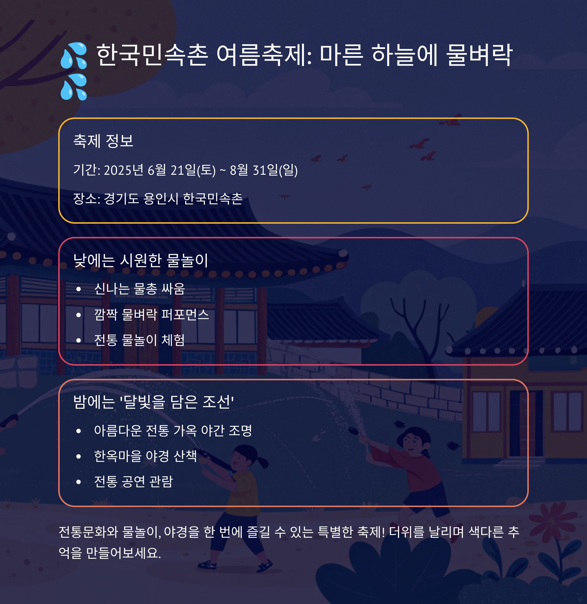 - 특징: 낮에는 시원한 물벼락 공연과 물총 싸움으로 더위를 날리고, 밤에는 '달빛을 담은 조선' 야간 개장으로 아름다운 야경을 즐길 수 있는 한국민속촌의 여름 대표 축제예요. 전통문화와 물놀이, 야경을 모두 경험하고 싶다면 이곳을 추천해요.