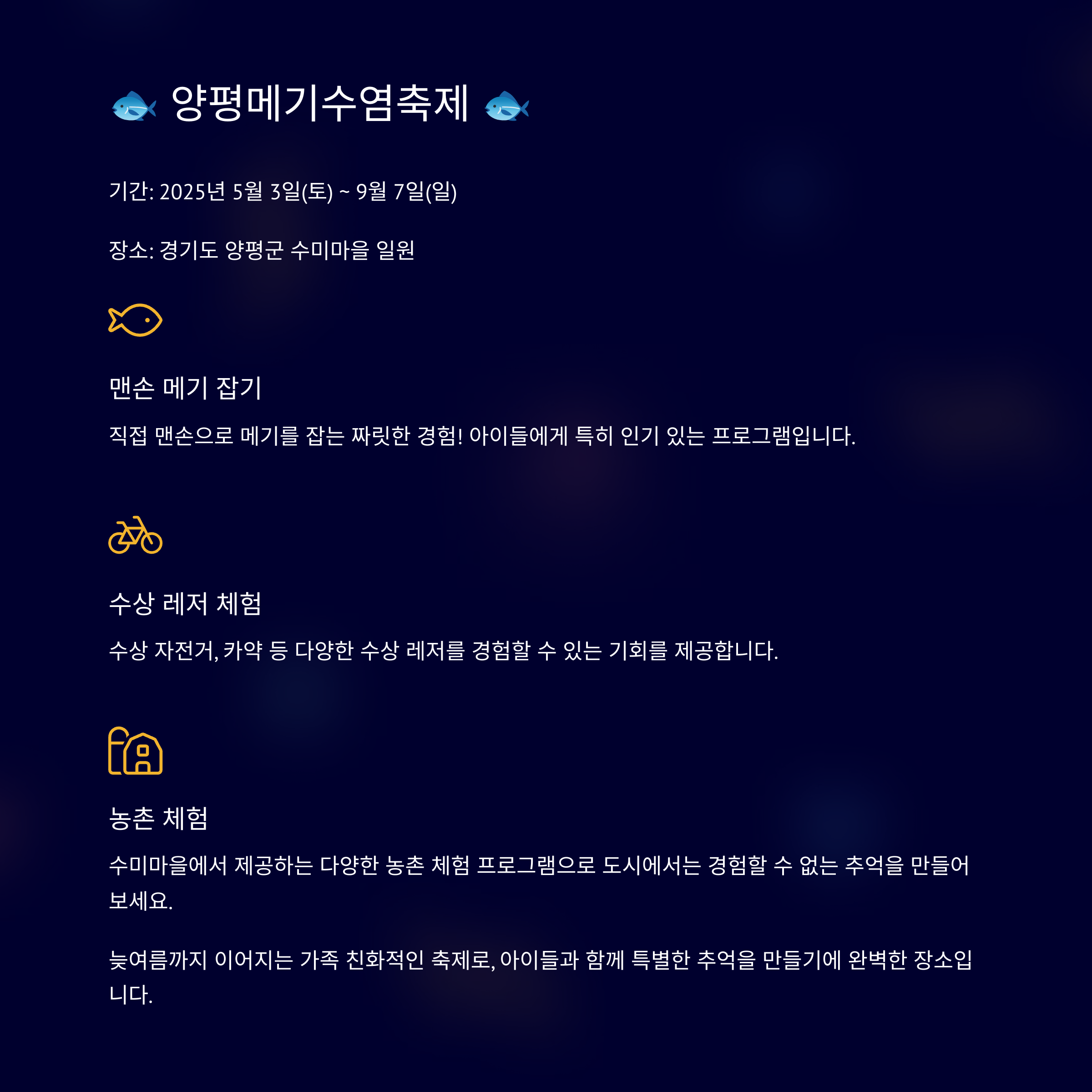 - 특징: 늦여름까지 이어지는 가족 친화적인 체험 축제예요. 맨손 메기 잡기, 물놀이, 수상 자전거 등 다양한 수상 체험과 농촌 체험을 즐길 수 있어 아이들과 특별한 추억을 만들기에 좋습니다. 신선한 공기와 함께 자연 속에서 활력을 되찾아보세요.